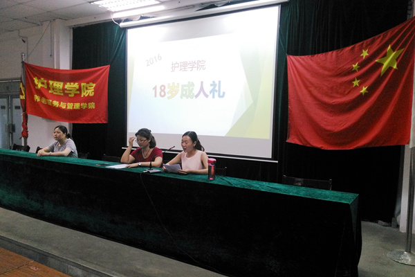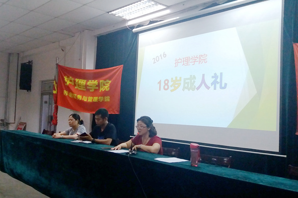 成人礼在《怒放的生命》激昂的旋律中拉开序幕。首先全体人员起立,奏《国歌》。随后,300余名护理学院18岁学生身穿护士服,戴着燕尾帽,高举右手许下青春誓言,以诚心对他人;以孝心对父母;以热心对社会;以忠心对国家是他们对18岁的承诺,标志着他们由未成年人向成年人转变。在成人礼仪式上,优秀学生代表贺玉玉同学进行发言。