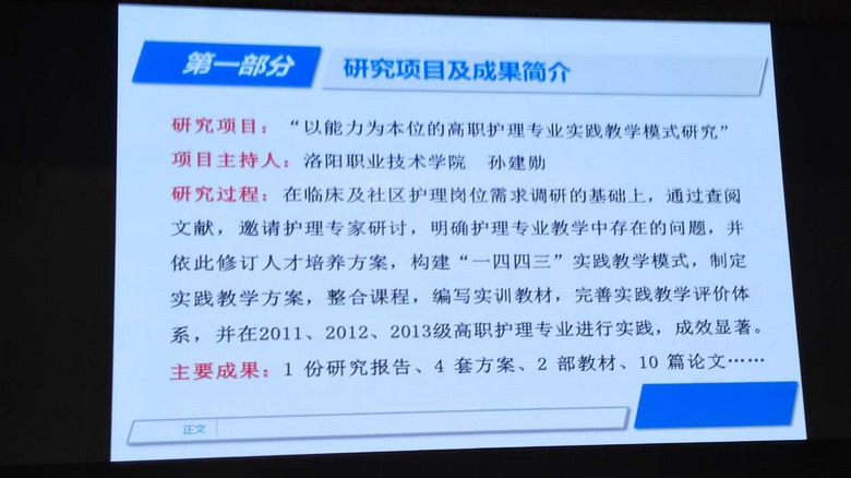 河南省高等教育教学成果奖获奖成果推广交流会旨在落实全省普通高校教学工作座谈会议精神,加强成果的宣传、推广和应用,充分发挥教育教学改革获奖成果的示范辐射作用,扩大成果奖的受益面,积极推进教育教学改革,切实提高人才培养质量。会上,共有7所高职院校的8个省级优秀成果奖代表汇报。今年会孙建勋副院长主持的“以能力为本位的高职护理专业实践教学模式研究”课题,围绕成果主要解决的教学问题、具体方法、创新点和实践推广应用效果等方面进行了汇报和交流。