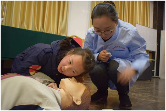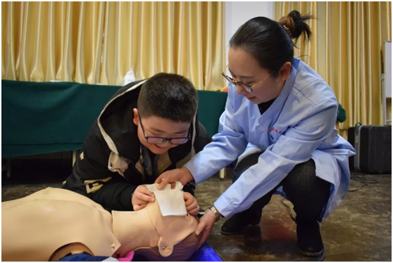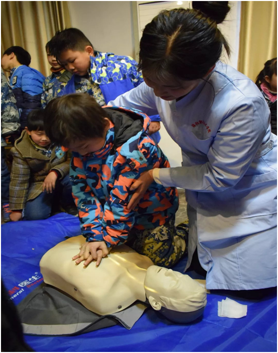 开场,王瑞丽老师通过卡通动画形式的视频,生动形象地讲述了有关心肺复苏的知识和技能,立刻就吸引住了小学员的目光。然后,王老师用简明易懂的手法为学员们示范了心肺复苏的标准操作流程,并手把手教学员们依次在模型人上演练胸外心脏按压、人工呼吸的操作技能,小学员们积极性非常高。