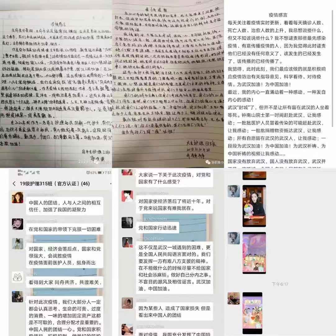 疫情发生以来,护理学院的全体教师队伍迅速从“假期模式”转入“战疫状态”,坚持全员上阵、全天关注、全心引导,志愿做离学生最近的人,坚决打赢疫情防控阻击战。