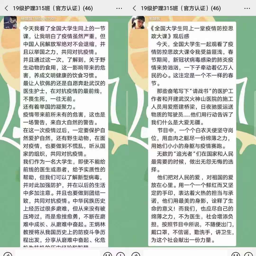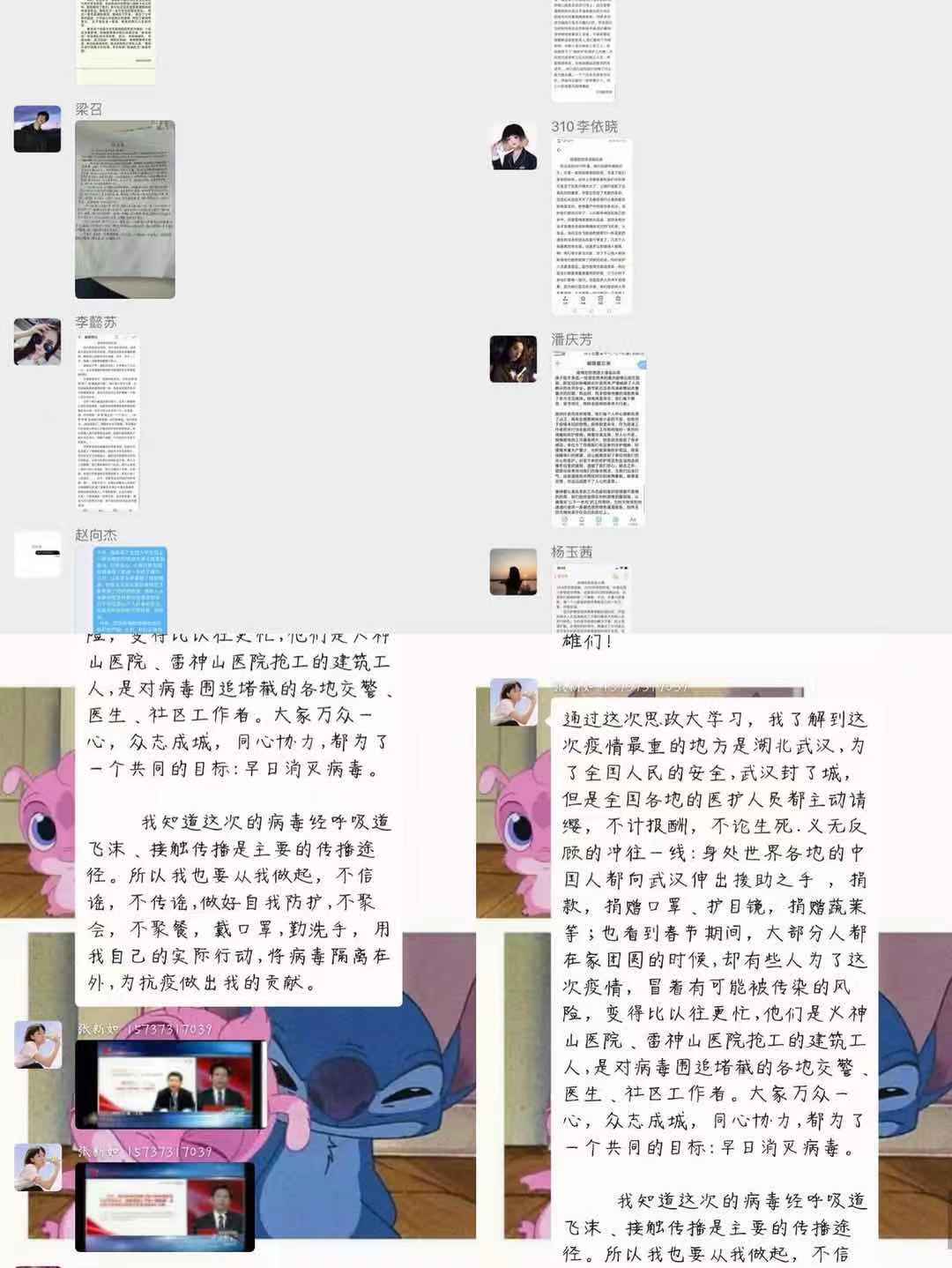看完直播后,在我们心中引发了无数的思绪,我们也该在自己的能力范围内做点力所能及的事。出门戴口罩佩,不去密集人员的地方。要保持乐观的心情,相信中国!相信武汉!我们一定会度过此次难关的。同学们上完课后,感触很深,都纷纷写下了观后感。