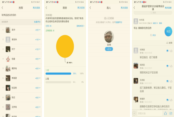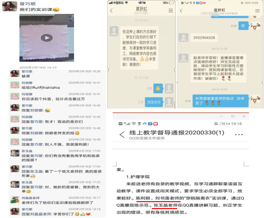 《基础护理学》课程组应用“超星学习通”进行线上授课,精心设计课前、课中、课后的教学安排。课前上传教学资源(校级精品课、大学慕课、护考直通车等),督促学生预习、做笔记;课上充分利用“学习通”进行在线直播授课或结合其他直播软件(QQ、雨课堂、钉钉等),通过发起“选人”、“抢答”、“测验”、“投票”、“问卷”、“讨论”等多种课堂活动,与学生进行互动答疑,充分调动学生的积极性;课后布置作业(录制操作视频、护考直通车、拍照片),或发放调查问卷,检测教学效果。