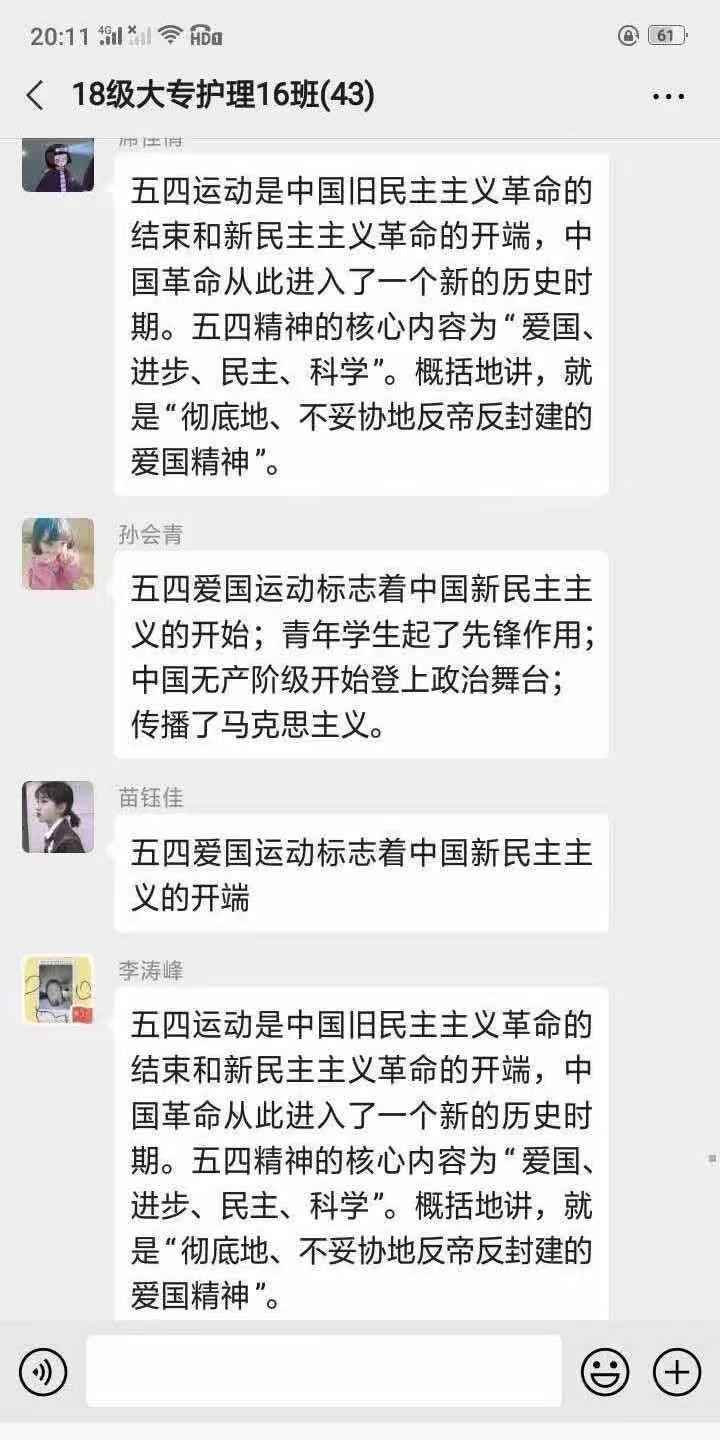 在4月30日下午,护理学院开展了以“五四青年节”为主题的线上团课,由各班团支书组织开展。主要从五四青年节时代背景,五四精神等方面对大家进行讲解,同学们认真听讲并积极发言。