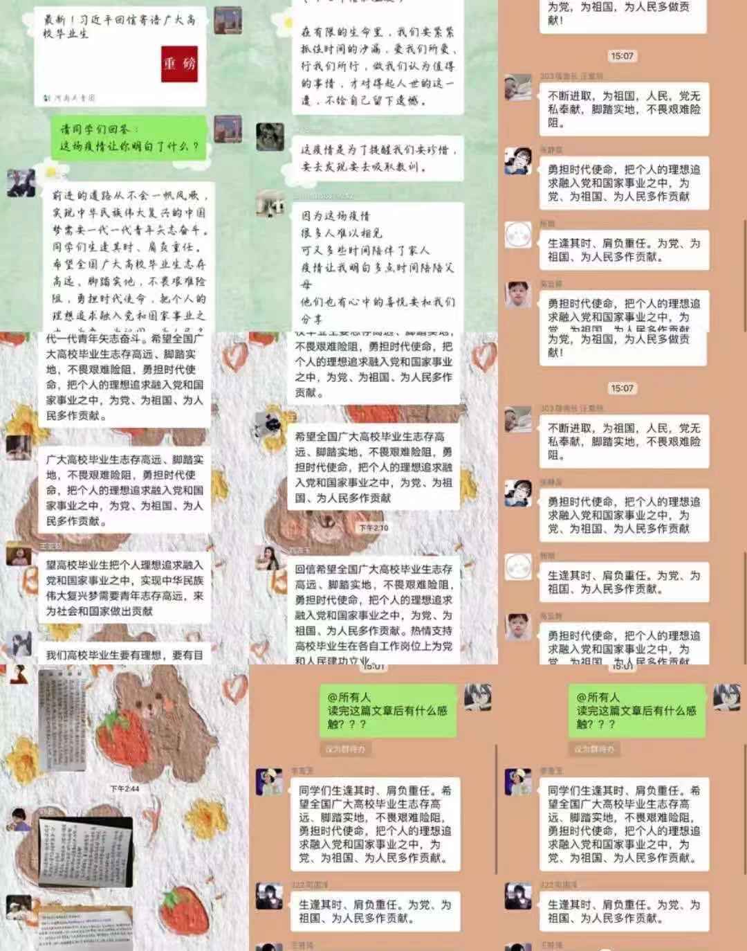 在7月9号下午,护理学院开展了以“习近平回信寄语广大高校毕业生”为主题的线上主题团课。由团支书组织开展,各班同学参与。