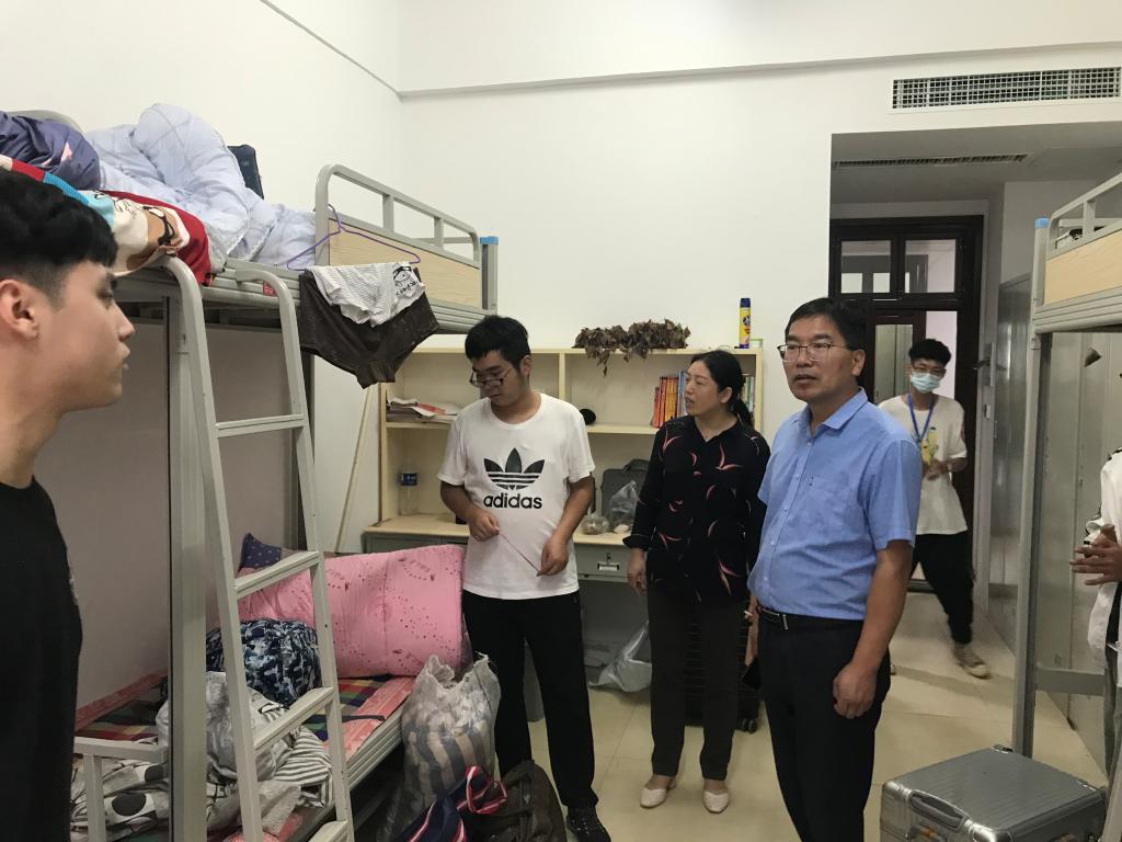 护理学院院长张志友,副院长尚艳芳、副院长刘书莲一同深入学生宿舍了解今年会学生宿舍安顿情况及入校率,就学生寝室消毒、卫生等问题提出整改要求,关心行动不便学生的住宿问题。学生安顿后,院长张志友召开护理学院学生返校复学疫情防控工作会议,保障学生能够快速适应疫情防控形势下的校园生活。