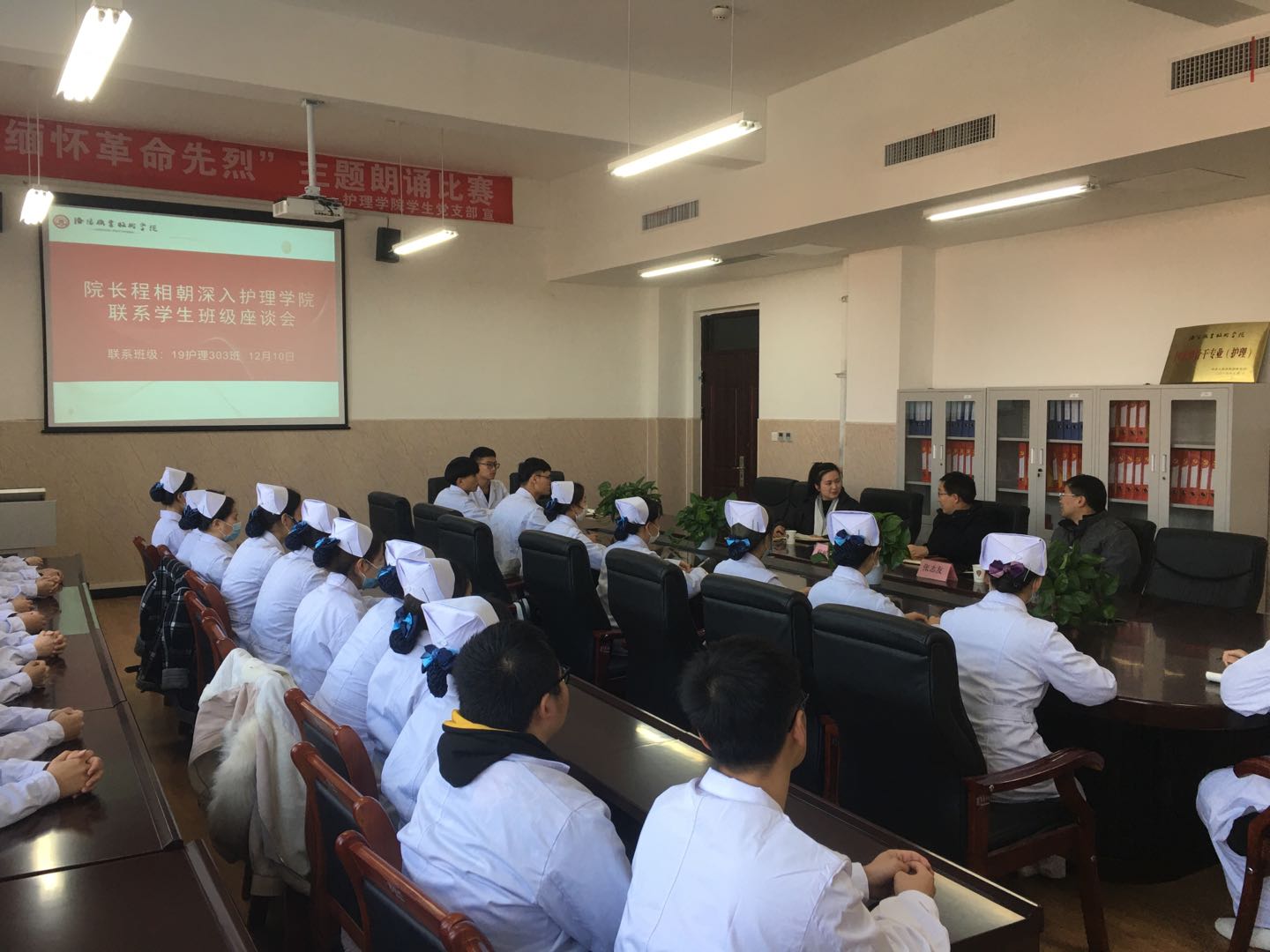 为落实立德树人根本任务,营造“三全育人”浓厚氛围,更加全面了解现阶段今年会大学生思想政治稳定性工作,10日下午,在伊滨校区,院长程相朝深入护理学院进行调研,并与师生在临床技能实训楼313会议室进行座谈会。护理学院院长负责同志及有关人员、院长办公室有关人员、19护理303班全体学生参加了此次座谈会。