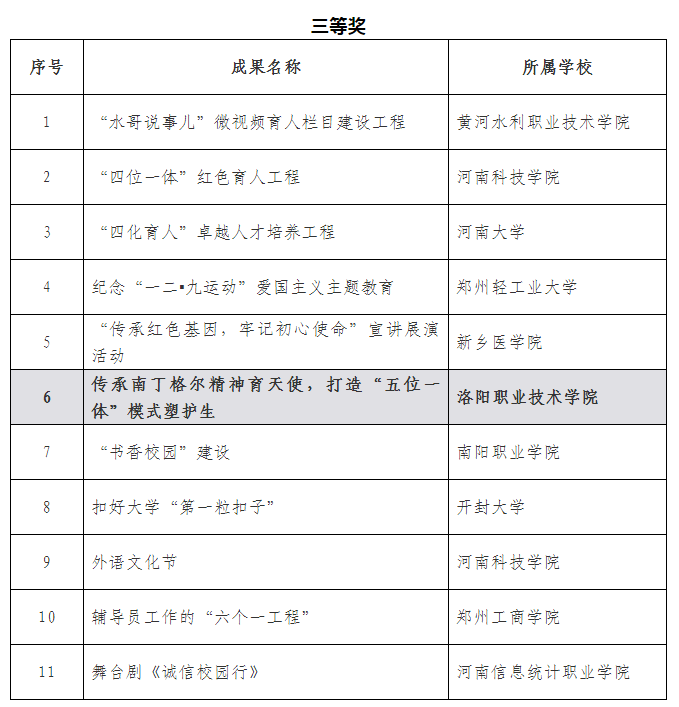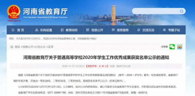 12月7日,河南省教育厅发布《关于普通高等学校2020年学生工作优秀成果获奖名单公示的通知》。