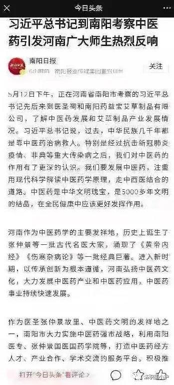 2021年5月12日下午,正在河南省南阳市考察的习近平总书记先后来到医圣祠和南阳药益艾草制品有限公司,了解中医药发展和艾草制品产业发展情况。习近平总书记说,过去,中华民族几千年都是靠中医药治病救人。特别是经过抗击新冠肺炎疫情、非典等重大传染病之后,我们对中医药的作用有了更深的认识。我们要发展中医药,注重用现代科学解读中医药是中华文明瑰宝,是5000多年文明的结晶,在全民健康中应该更好发挥作用。