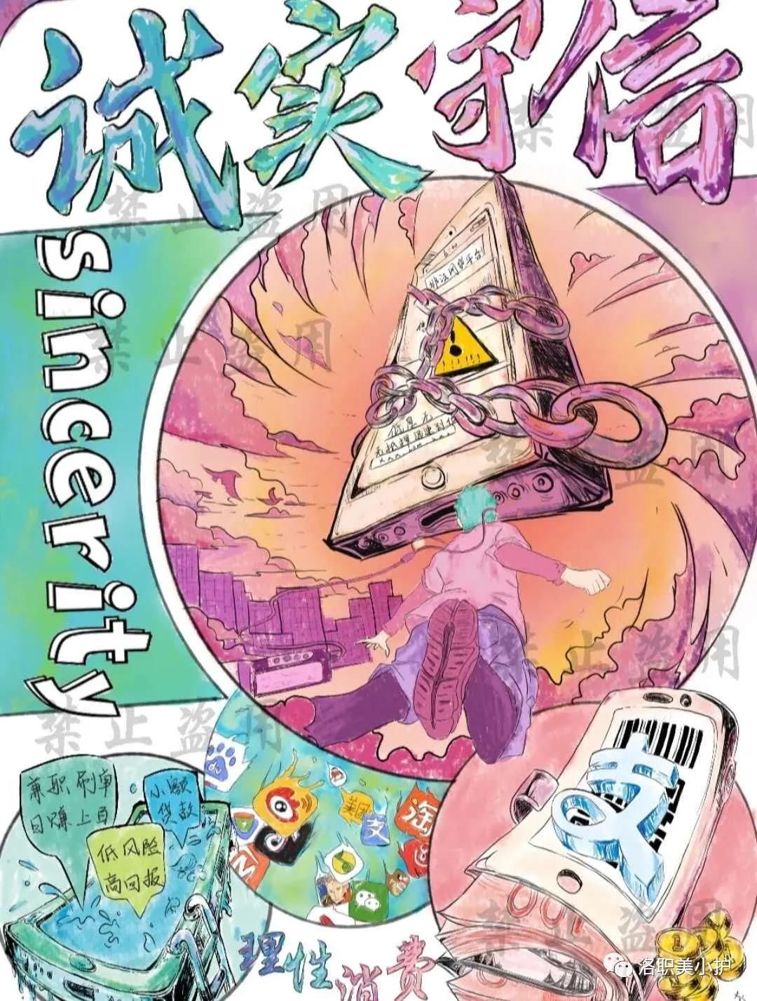为了推进诚信教育、金融知识普及教育,引导广大青年学生珍爱信用、理性借贷、不负信任,提高学生的征信意识、金融意识、风险意识、法律意识,增强当代大学生的责任感,帮助他们树立正确的消费观、荣辱观、价值观,护理学院特举办“诚信教育校园行”系列活动,在2021年6月11日发布了“诚信助你画就美好未来”电子海报征集通知后,我们共收到来自33个班级的百余幅作品,经过层层筛选,10幅作品从中脱颖而出,下面让我们来看看吧: