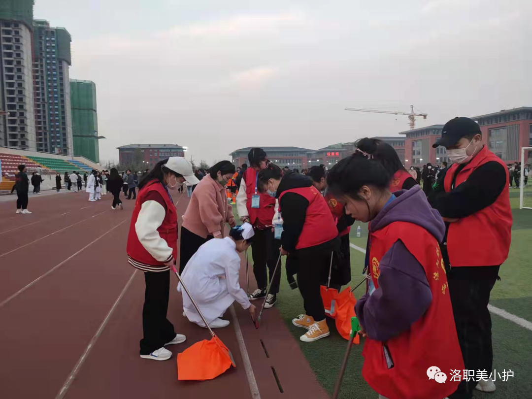 在激烈的校级足球赛落下帷幕之后,有这样一群可爱的人默默地在校园、操场的角角落落,清理卫生死角,护理学院20级、21级共三十余名志愿者开始了他们忙碌的志愿服务活动,他们身着红色小马甲,如一团团热情的火焰,温暖着校园,在蓝天、白云、绿树的陪伴下,他们显得愈发迷人。