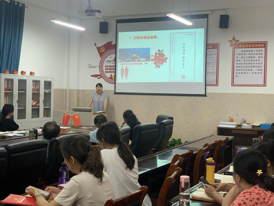 2022年6月16日下午,护理学院党总支教工党支部书记刘书莲同志,为支部全体党员上了一堂以《咬定青山不放松 愚公移山洛职“中”》为题的党课。讲课之前,刘书记提出问题:双高校中期验收和职教本科阶段性验收工作将至,在这攻坚克难的紧要关头,每一位党员教师应深入思考应该怎么干?如何干?
