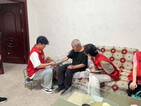 护理专业李洁同学用专业技能为老奶奶测血压,解释血压值。智慧康养专业刘文豪同学有丰富的大赛经验,在与奶奶交流的时候得知,山上一共有20户人家,目前只有他们老两口在这住,平时都不怎么见人,奶奶看到我们来非常开心。随后志愿者一行人又来到70多岁老党员家中,听村支书讲,虽然他年龄大,但很勤快热心,村里有工作都是积极参加。