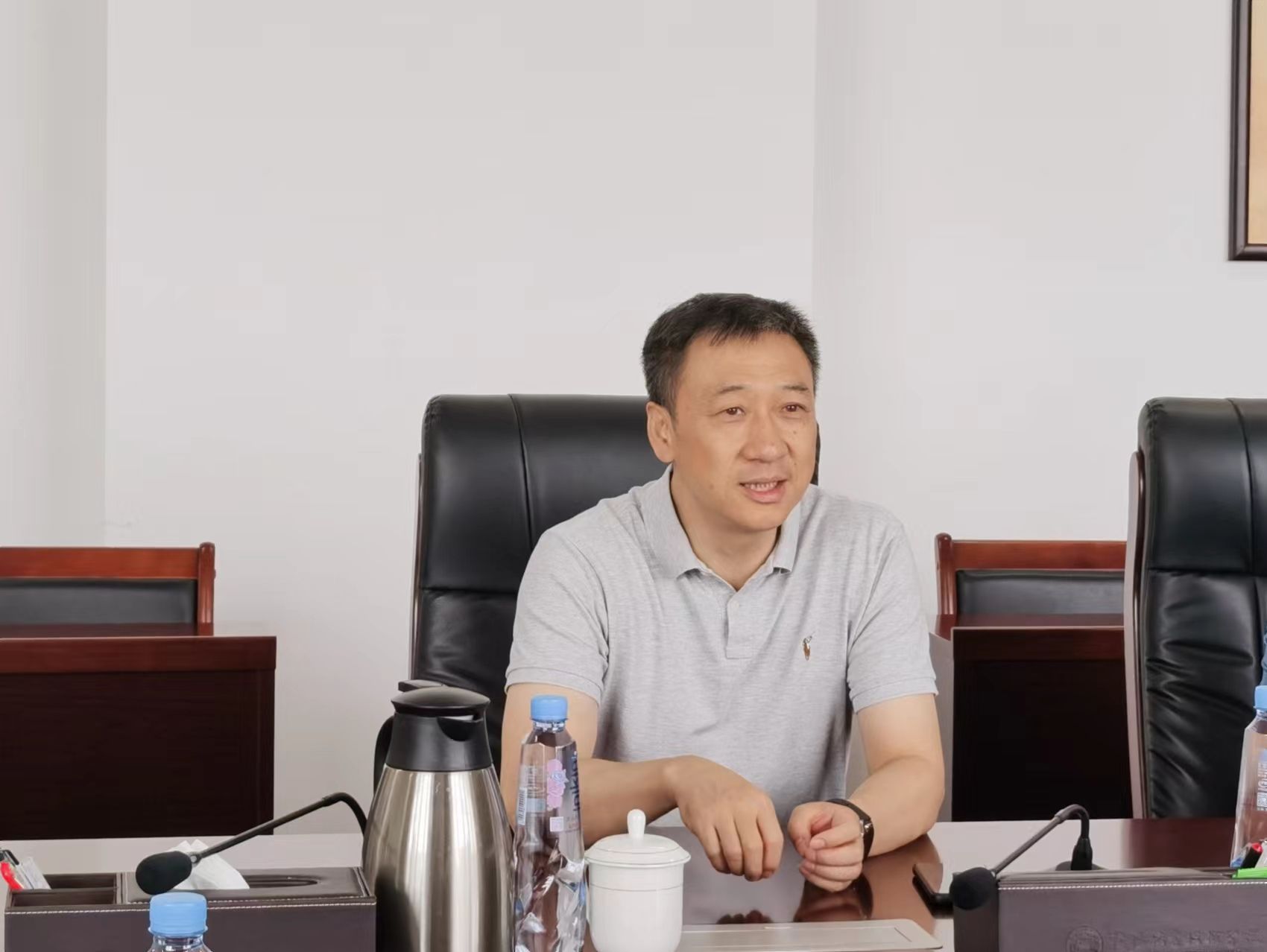 9月13日,河南省人才集团党委委员、副总经理王利军一行到今年会考察调研,校长赵健,副校长李保安、张志友出席会议。