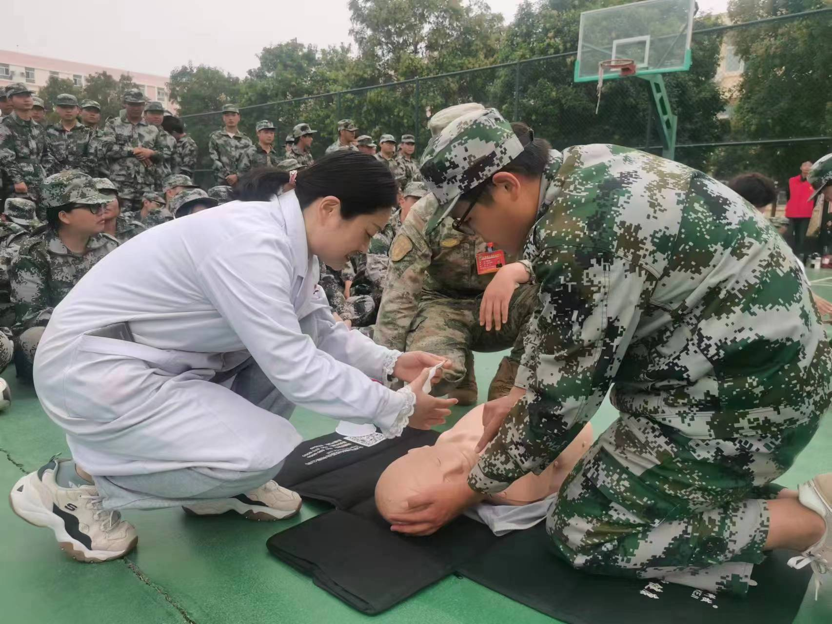 培训结束后,培训老师在各个连队,进行现场实操演示。他们借助模拟人教具向学生们讲解了心肺复苏急救的详细操作步骤,并指导大家如何进行心肺复苏、如何做高质量的胸外按压、如何人工呼吸等心肺复苏急救知识和技能,并进行了高质量的示范操作演示。示范结束后,每一位学生都获得了一次训练的机会,学以致用,对所学的急救知识有了更深刻的理解。