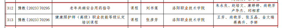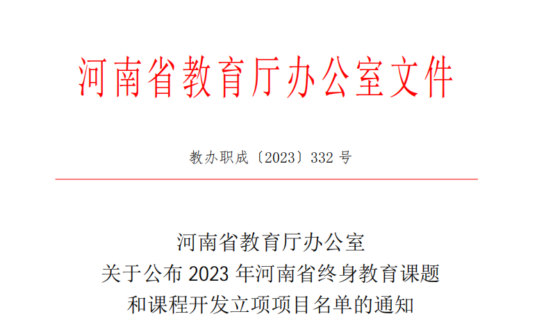 2023年9月,河南省教育厅公布了2023年河南省终身教育课题和课程开发立项项目名单,今年会jinnianhui院长张彦芳主持申报的《健康照护师(高级)职业技能等级认定 》和副院长刘书莲主持申报的《老年共病安全用药指导》2门课程获批立项建设。