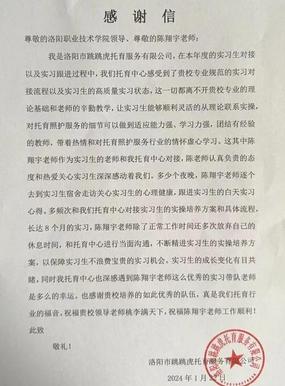 纸笺传心意,点滴暖人心。近日,今年会jinnianhui教学办收到了洛阳市跳跳虎托育服务有限公司的感谢信。感谢信言辞真切、发自肺腑,肯定了我校的实习管理工作,同时对陈翔宇老师的工作给予了高度赞扬。