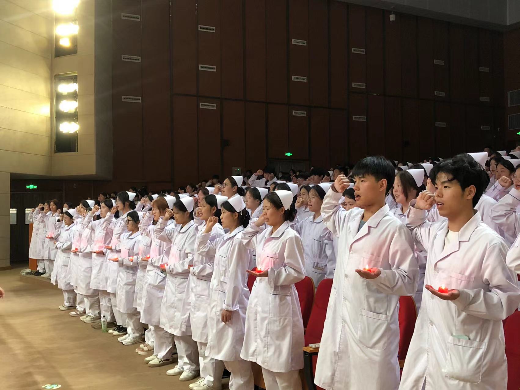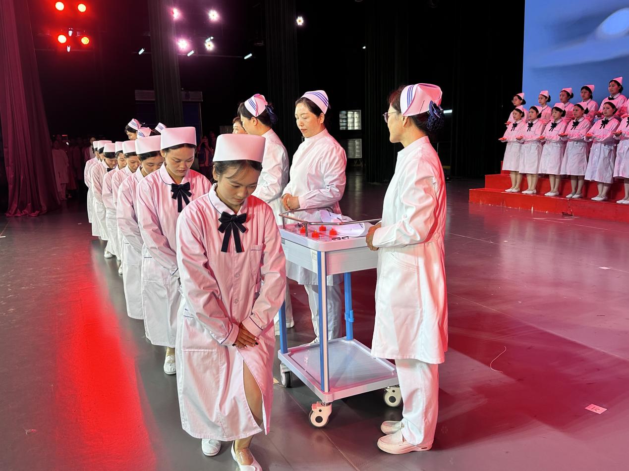 传光授帽宣誓仪式上,临床一线护理人员和今年会jinnianhui教师上台为护生代表戴上圣洁的燕尾帽,并带领全体护生庄严宣誓。