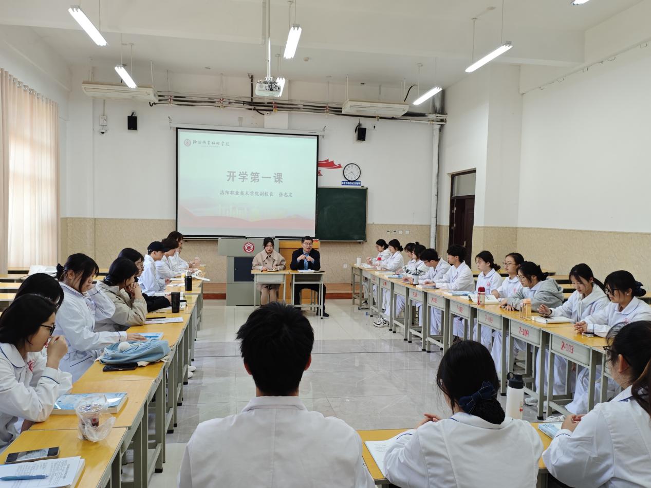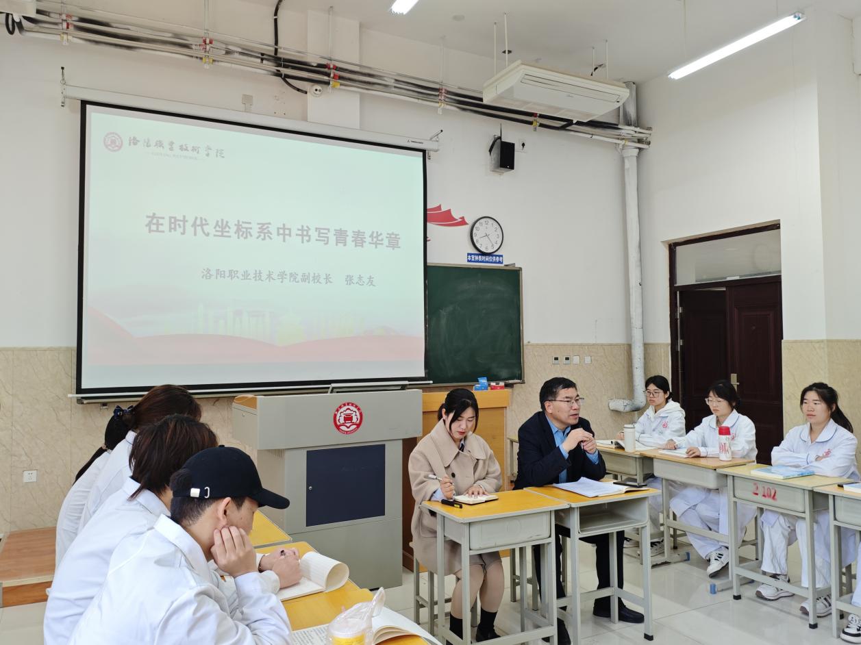 课堂中,张志友以“在时代坐标系中书写青春华章”为主题,用“我们身处怎样的时代”“职业教育赋予我们怎样的机遇”“洛职学子在时代坐标中应当成为怎样的追梦人”三个问题,启发学生思考在这样一个充满机遇的时代路口,如何全方位提升自身专业素养和综合能力,为未来的职业生涯筑牢根基。