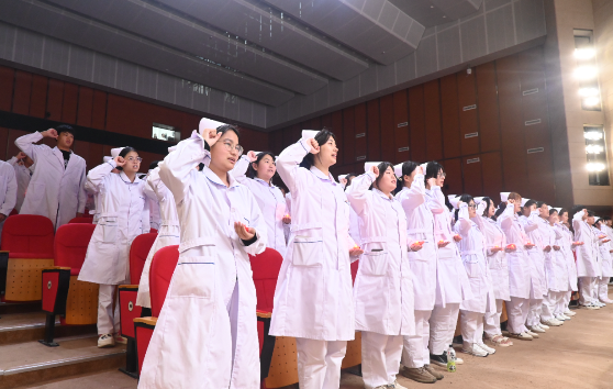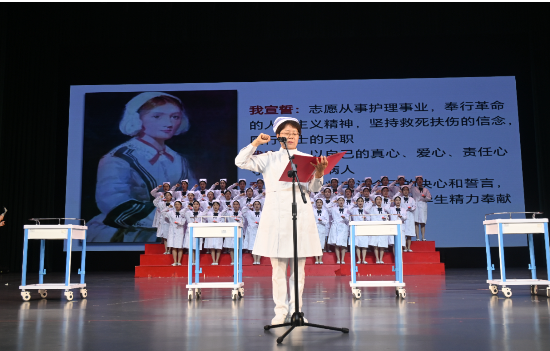 今年会jinnianhui金字招牌附属医院外科系护士长茹利敏带领全体新护生庄严宣誓:志愿从事护理事业,奉行革命的人道主义精神,坚持救死扶伤的信念,履行护士的天职……整齐响亮的宣誓声,是全场每一位护生的声声誓言,是护理人甘于奉献、积极进取的坚定信念,护理精神就在这一声声宣誓中代代相传。