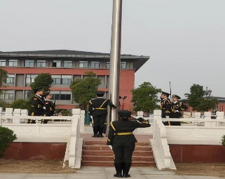 第二项:升旗。刘亚洲宣布升国旗奏国歌。随着国歌奏响,国旗冉冉升起,迎风飘扬,全体人员肃立注目,心中充满对祖国的无限敬意与热爱。
