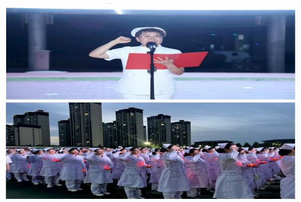 在护理专家的领誓下,全体学生右手握拳,面向南丁格尔画像庄严宣誓。铿锵誓言回荡夜空,诠释守护生命的无悔承诺。