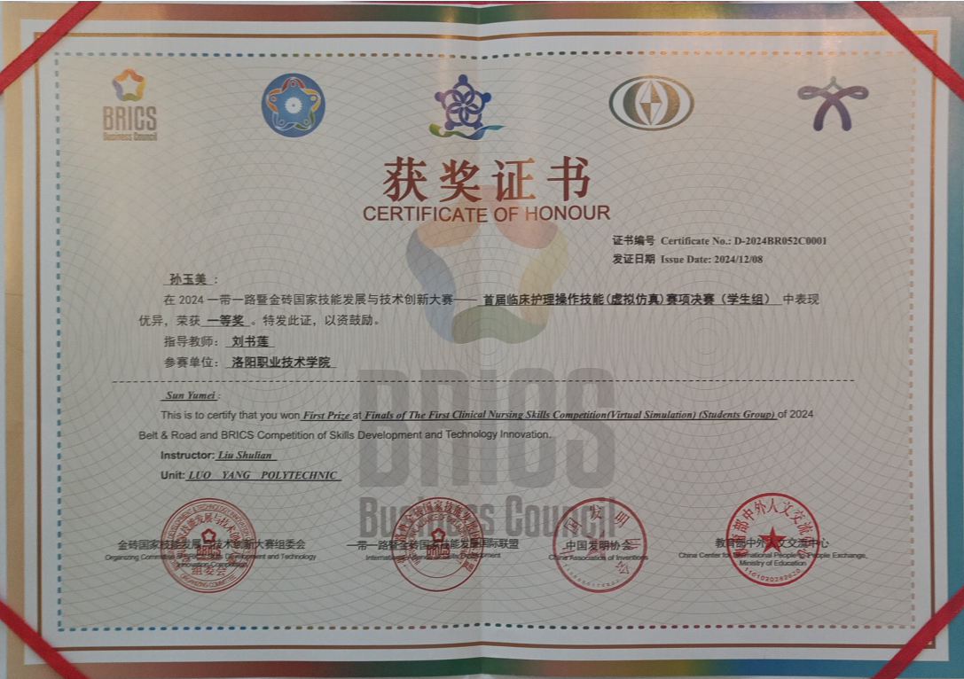 1 | 2024一带一路暨金砖国家技能发展与技术创新大赛之首届临床护理操作技能(虚拟仿真)赛项教师组 | 一等奖1项 |