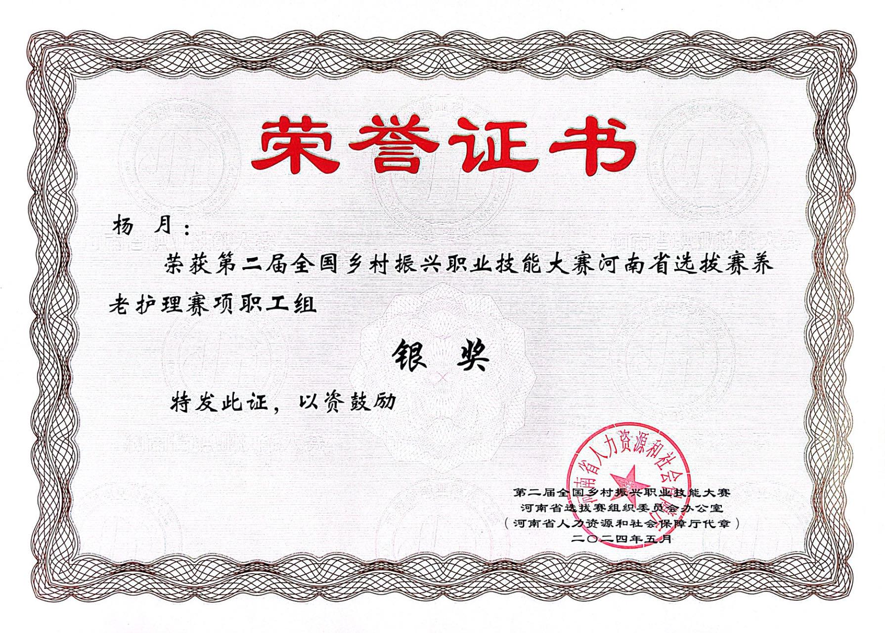 4 | 2024全国第二届乡村振兴职业技能竞赛河南省选拔赛养老护理项目学生组银奖 | 河南省人力资源和社会保障厅 | 2024.05 |