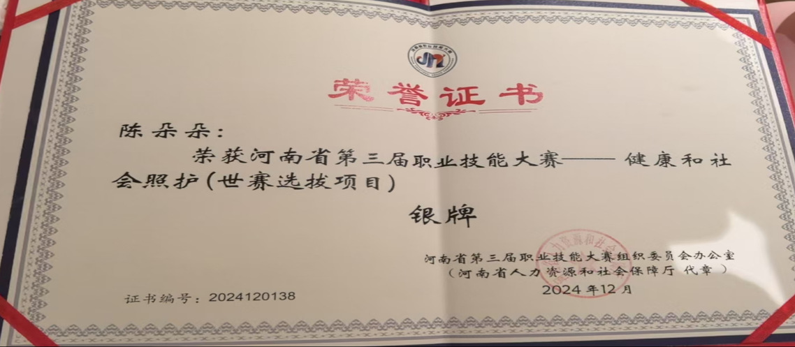3 | 2024全国第二届乡村振兴职业技能竞赛河南省选拔赛养老护理项目职工组银奖 | 河南省人力资源和社会保障厅 | 2024.05 |