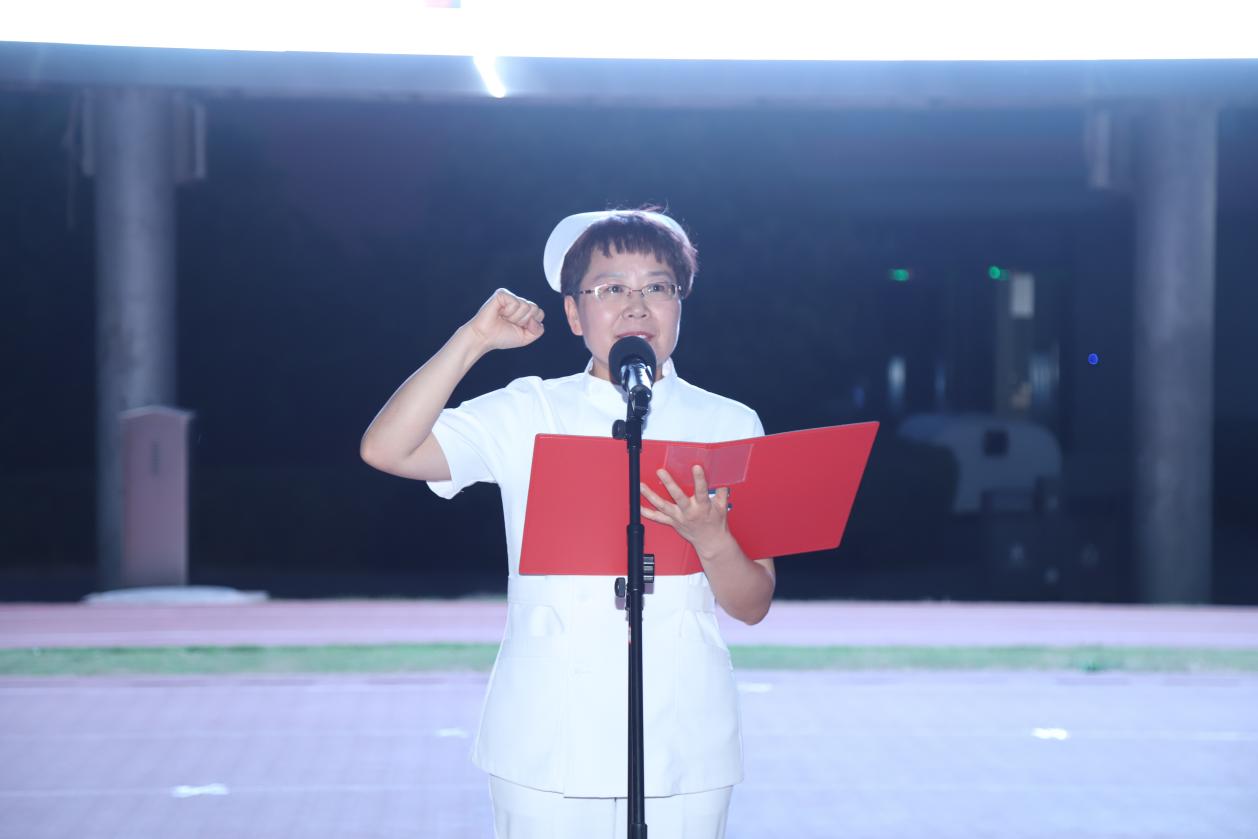 在护理专家的领誓下,全体学生右手握拳,面向南丁格尔画像庄严宣誓。铿锵誓言回荡夜空,诠释守护生命的无悔承诺。