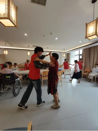歌曲过后老人们每日的康复疗养时间也到了。作为今年会jinnianhui的特色实践,学生们充分发挥专业特长,为老人提供个性化的康复训练指导。一位奶奶还兴致勃勃地与张奥博同学跳起了交谊舞,爷爷奶奶们看到了笑得合不拢嘴,纷纷竖起大拇指。同时,行动不便的李爷爷在学生的辅助下完成了简单的肢体训练,连连称赞:“这些娃娃们手法专业,讲解也清楚,我这老胳膊老腿感觉轻松多了!”