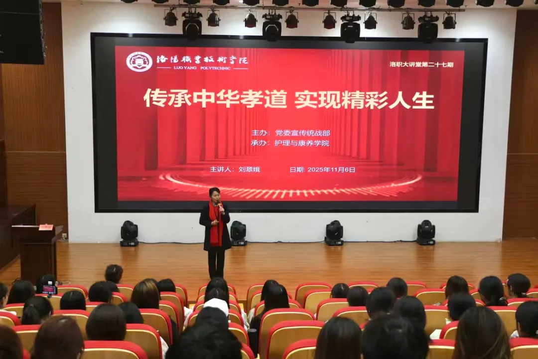 2025年11 月 6 日,洛职大讲堂第27期在大学生活动中心心理剧场举行,河南省儒学文化促进会讲师团副团长、高级政工师刘翠娥,带来“传承中华孝道 实现精彩人生”专题讲座。讲座以孝道文化为核心,结合鲜活案例与深刻感悟,为全校师生带来了一场浸润心灵的文化盛宴,推动中华优秀传统文化在青年一代中落地生根。